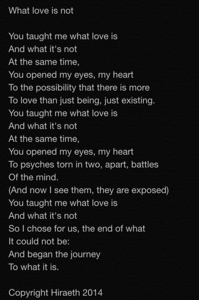 What love is not July 11, 2015 ~ hiraethphoenix Share this: Click to share on X (Opens in new window) X Click to share on Facebook (Opens in new window) Facebook Like Loading... Related